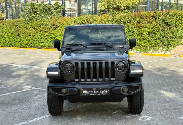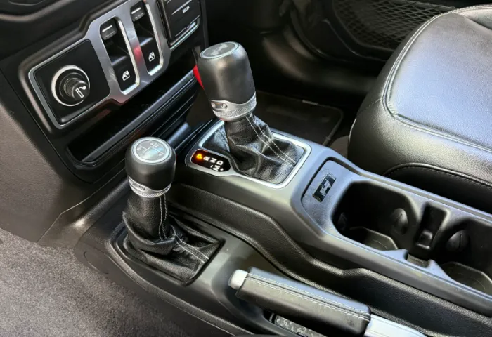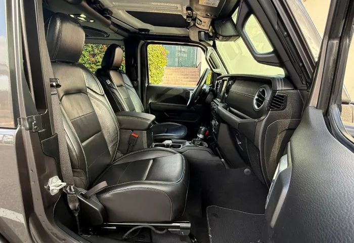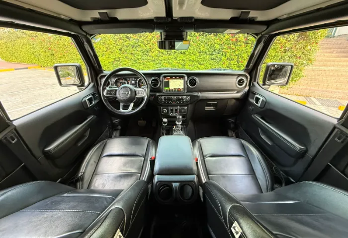 Interior: - Leather-trimmed seats and leather-wrapped steering wheel with controls. - Premium soft-touch door panels. - Infotainment system with an 8.4-inch touchscreen (Uconnect). - Standard navigation and Apple CarPlay/Android Auto. - Jeep's Performance Pages with off-road gauges (pitch/roll). - Weatherproof floor with one-way drain plugs.