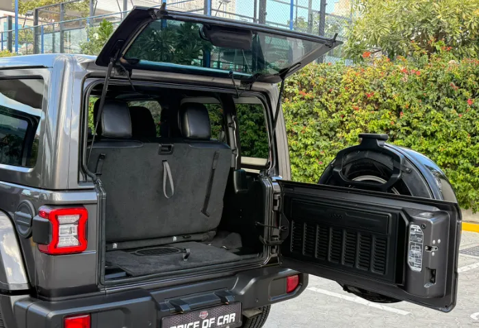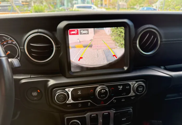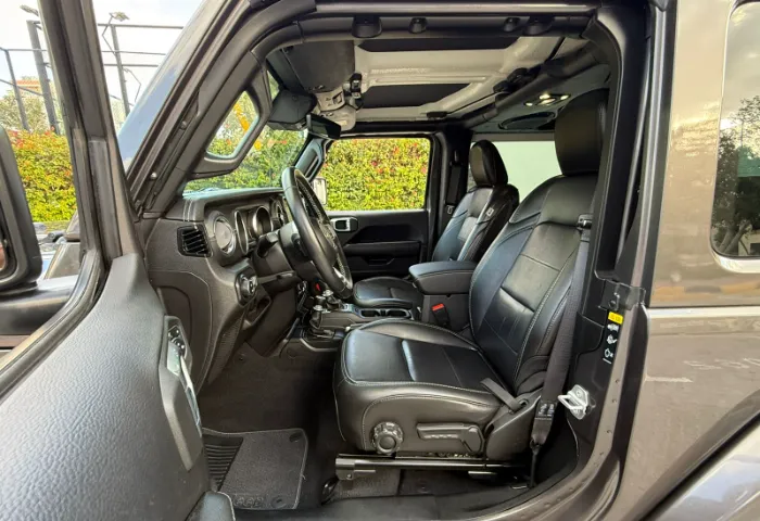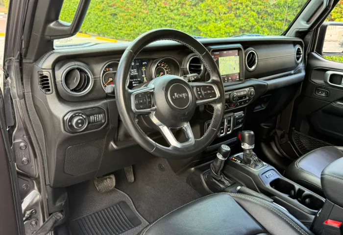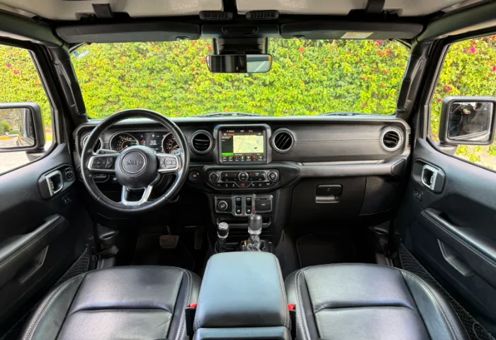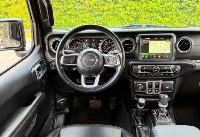 Interior: - Leather-trimmed seats and leather-wrapped steering wheel with controls. - Premium soft-touch door panels. - Infotainment system with an 8.4-inch touchscreen (Uconnect). - Standard navigation and Apple CarPlay/Android Auto. - Jeep's Performance Pages with off-road gauges (pitch/roll). - Weatherproof floor with one-way drain plugs.